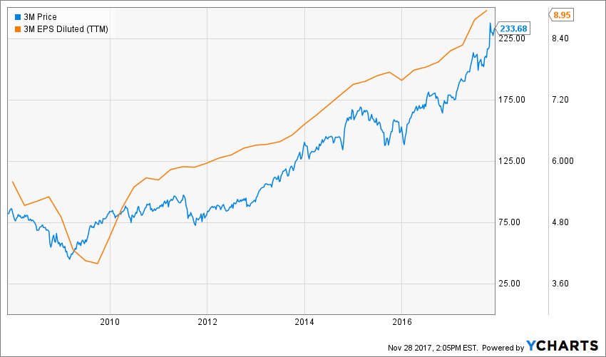 Let’s use 3M Co (MMM) as an example. Here’s a graph showing MMM stock price along with its earnings per share (EPS):