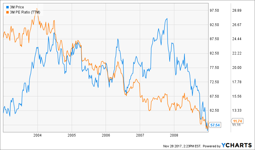 As you can see, MMM used to trade over a 26 PE ratio before the latest crisis. You can also note how fast the stock price dropped during the financial crisis: